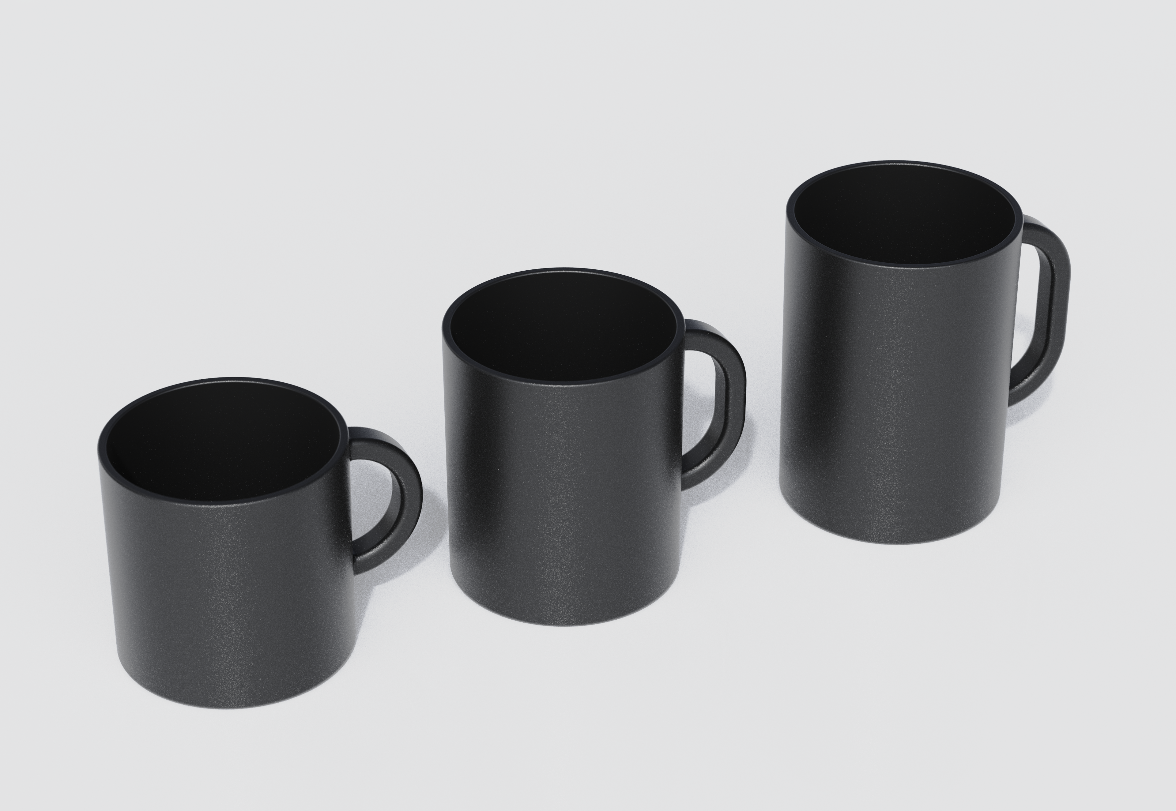 미니멀한 컵입니다. 컵 높이는 왼쪽부터 오른쪽으로 100mm / 120mm / 140mm 입니다. 밑면 지름은 100mm으로 모두 동일하지만, 상승하는 각도가 89.5도로 상단의 지름은 각기 다 다릅니다.